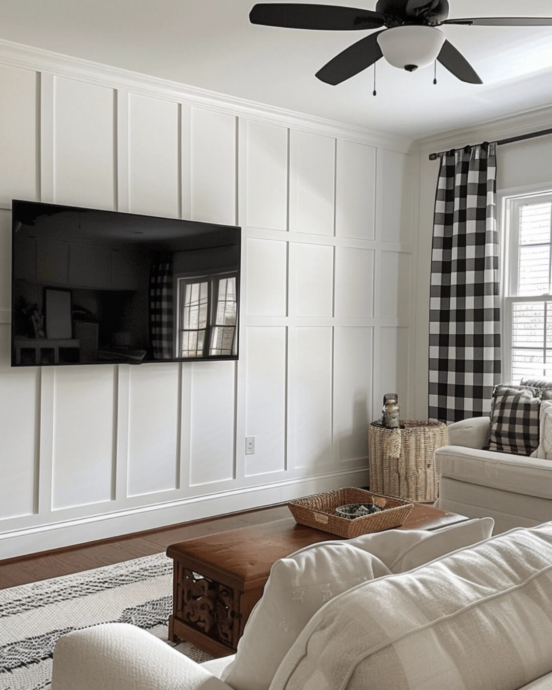 An accent wall with a Gingham pattern adds warmth and elegance, making the space feel inviting and refined.