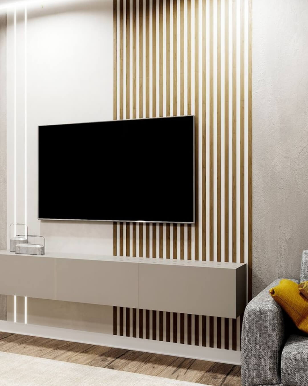 Wood Slats is a stylish and modern design consisting of horizontal or vertical wooden slats that create a visually appealing texture and structure on the wall. This finishing option adds warmth, naturalness, and a contemporary look to the interior.