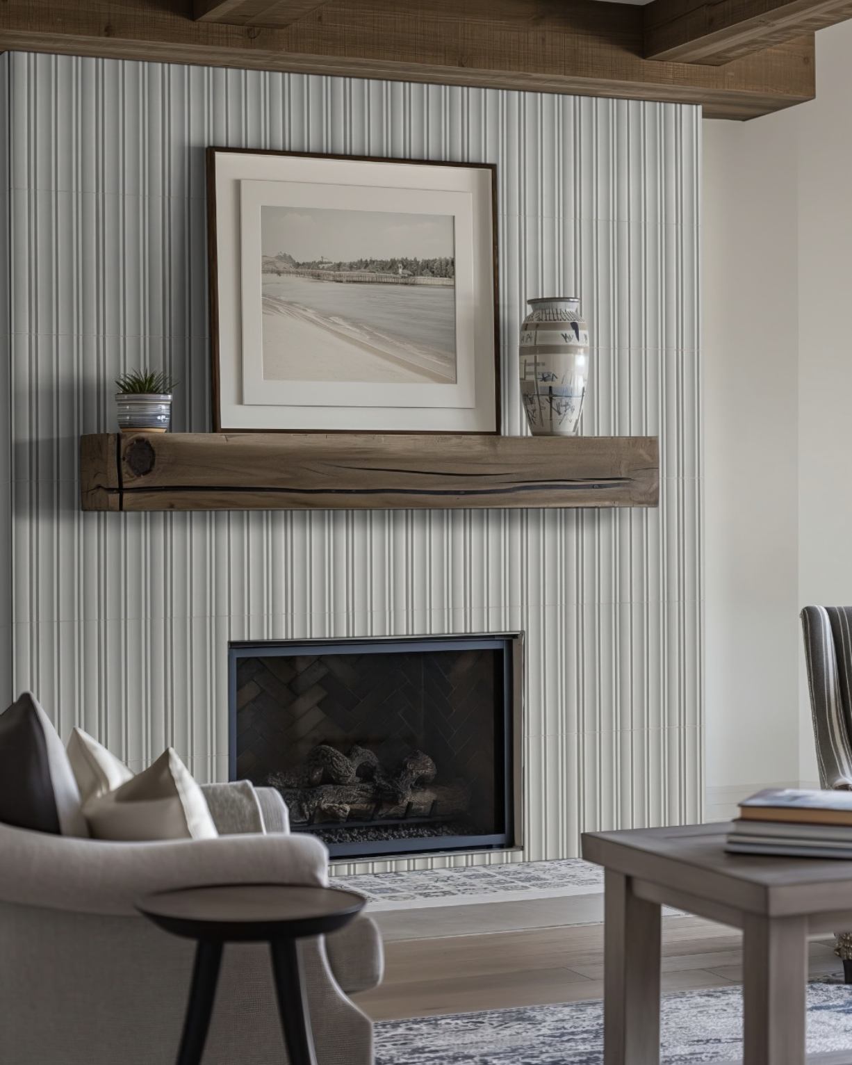 A clean, minimal fireplace design with a slim build-out that blends naturally into the wall.