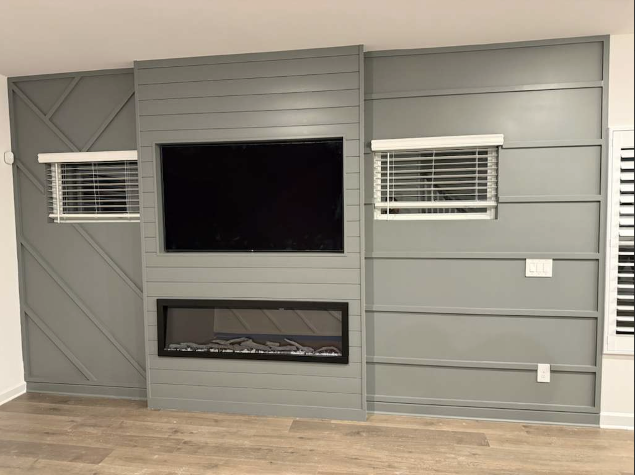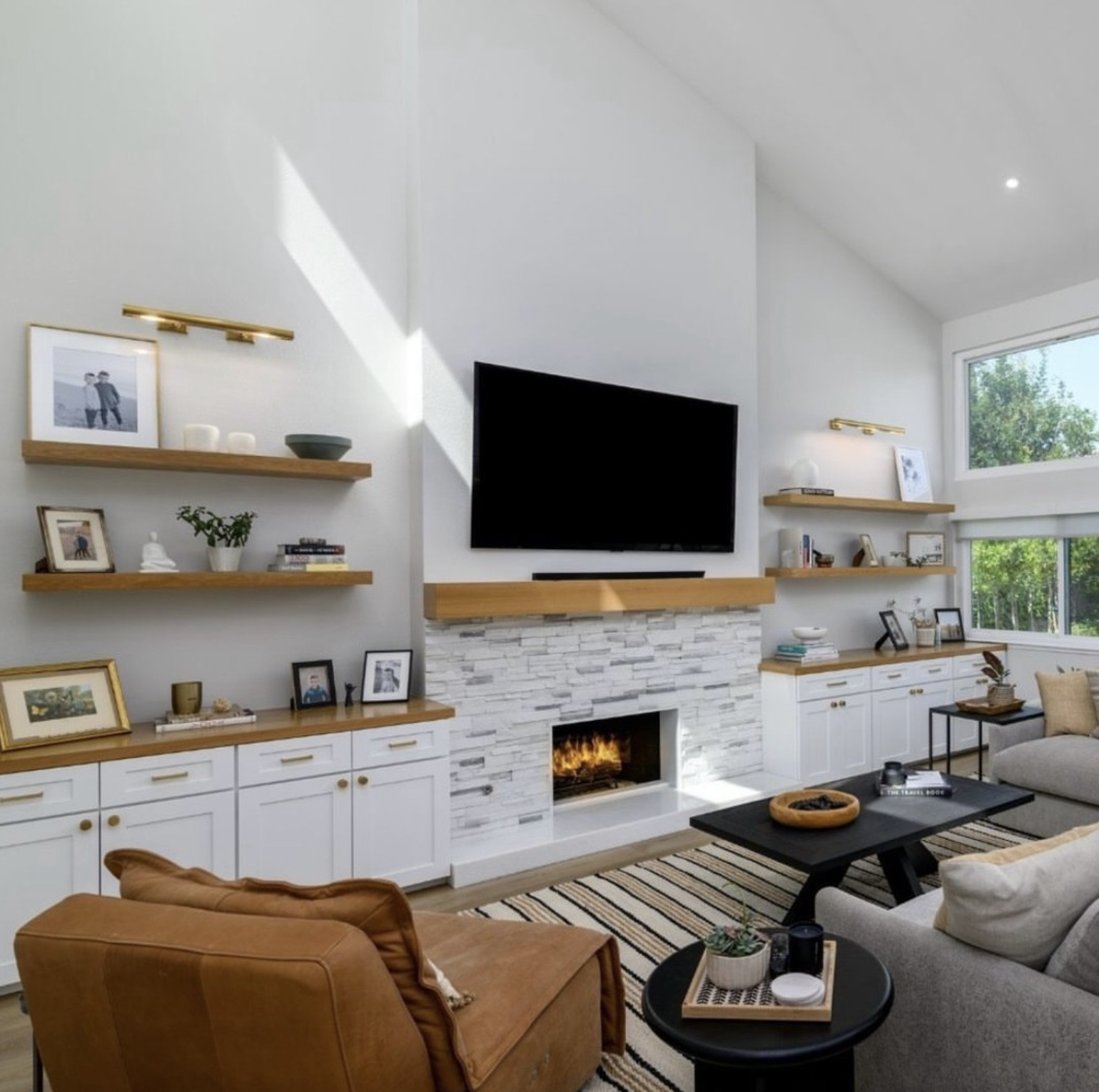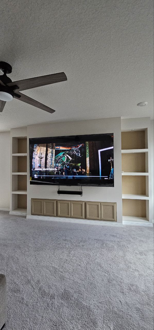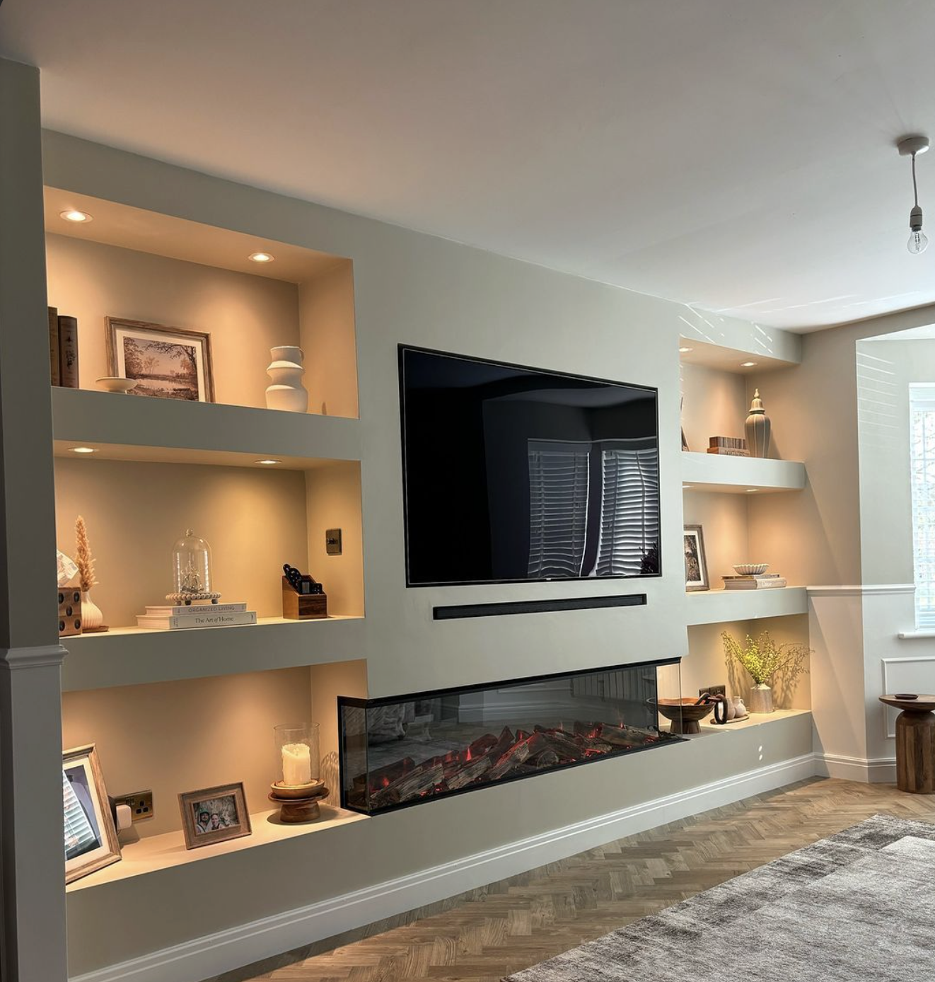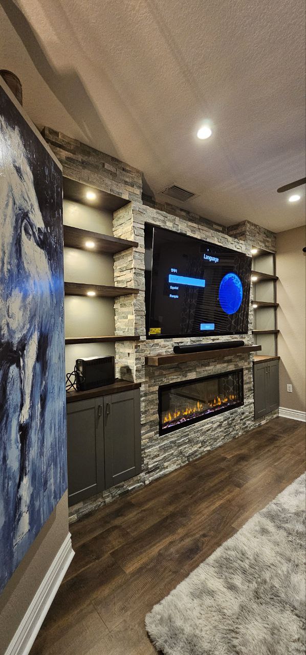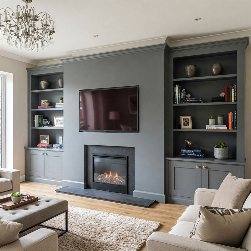 Design: A structured layout that frames the TV, fireplace, or decorative niches for a balanced, built-in look.