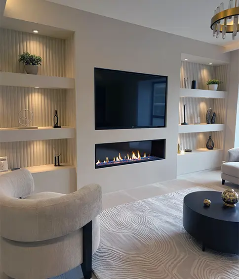 Luxury fireplace walls often include custom niches, integrated lighting, and premium finishes. Each project is designed as a one-of-a-kind centerpiece that elevates the overall feel of the interior.