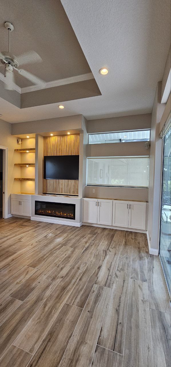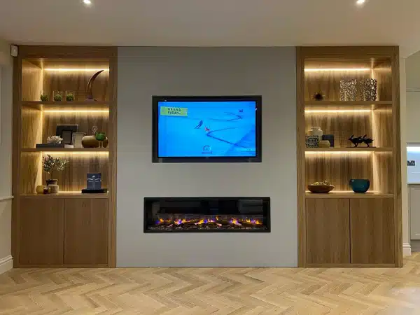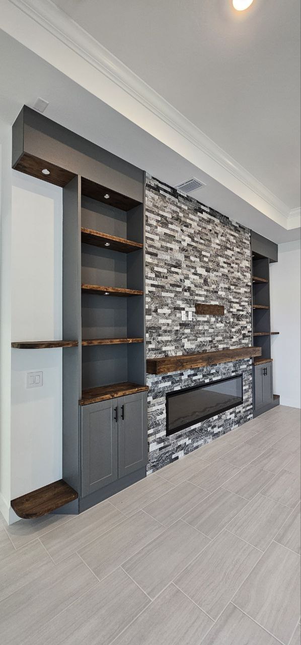 A functional fireplace wall that combines a built-in fireplace with shelves or cabinetry.